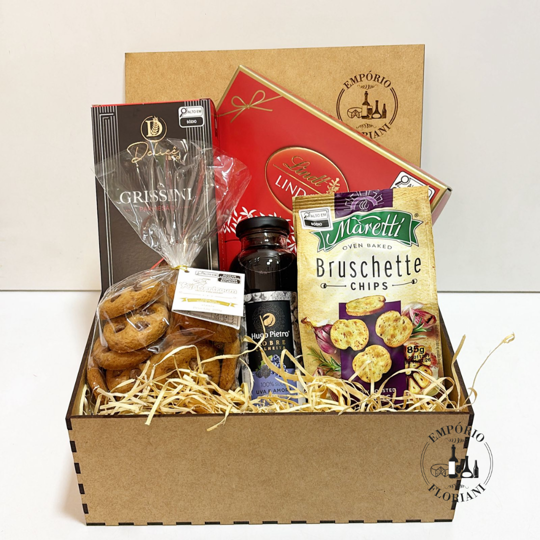Contém: bombons chocolate importado, grissini, biscoito artesanal, bruschetta, suco premium
