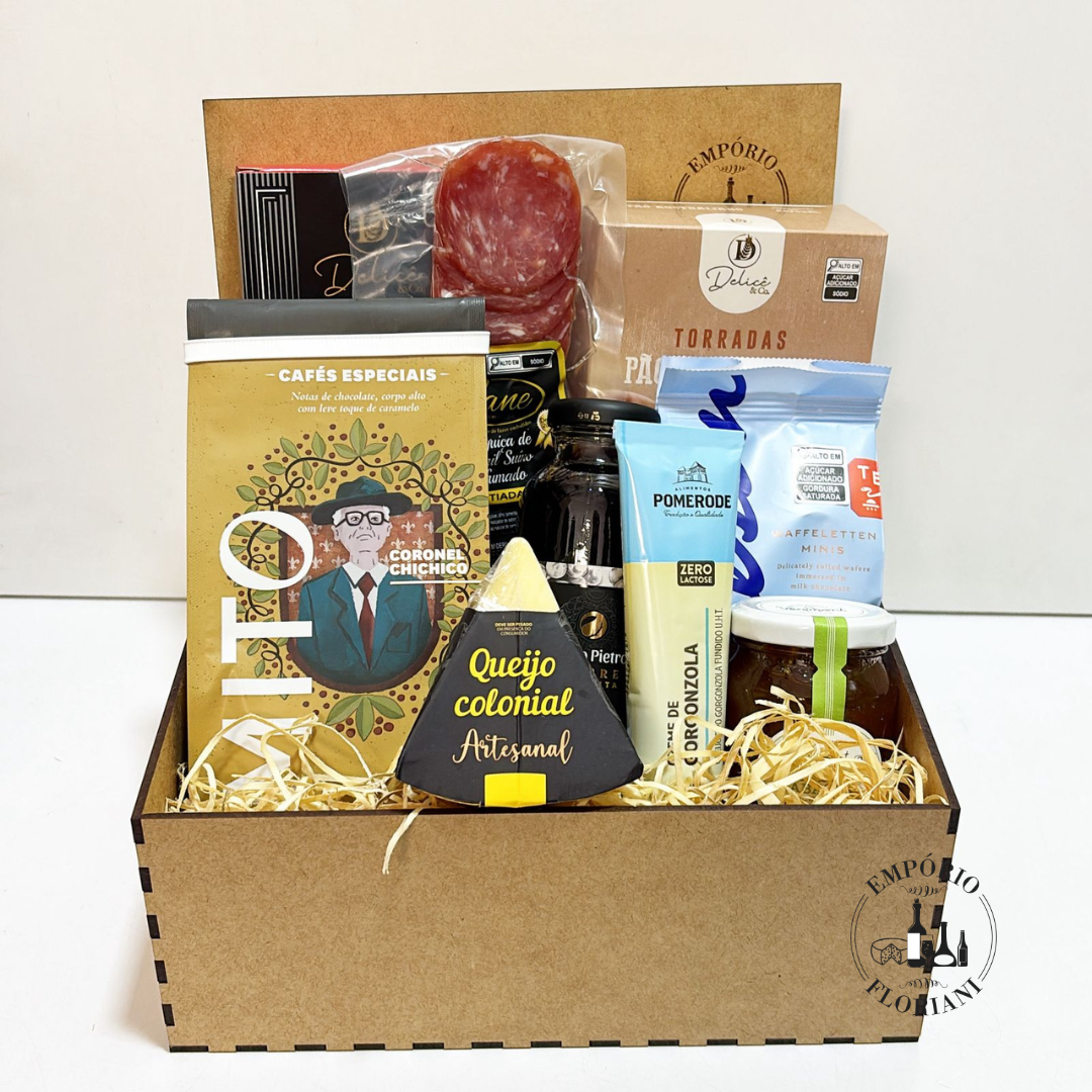 Contém: torradas, salame, queijo "in natura", café especial, suco premium, patê, geleia, grissini, biscoito importado.