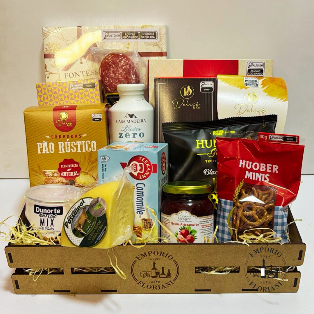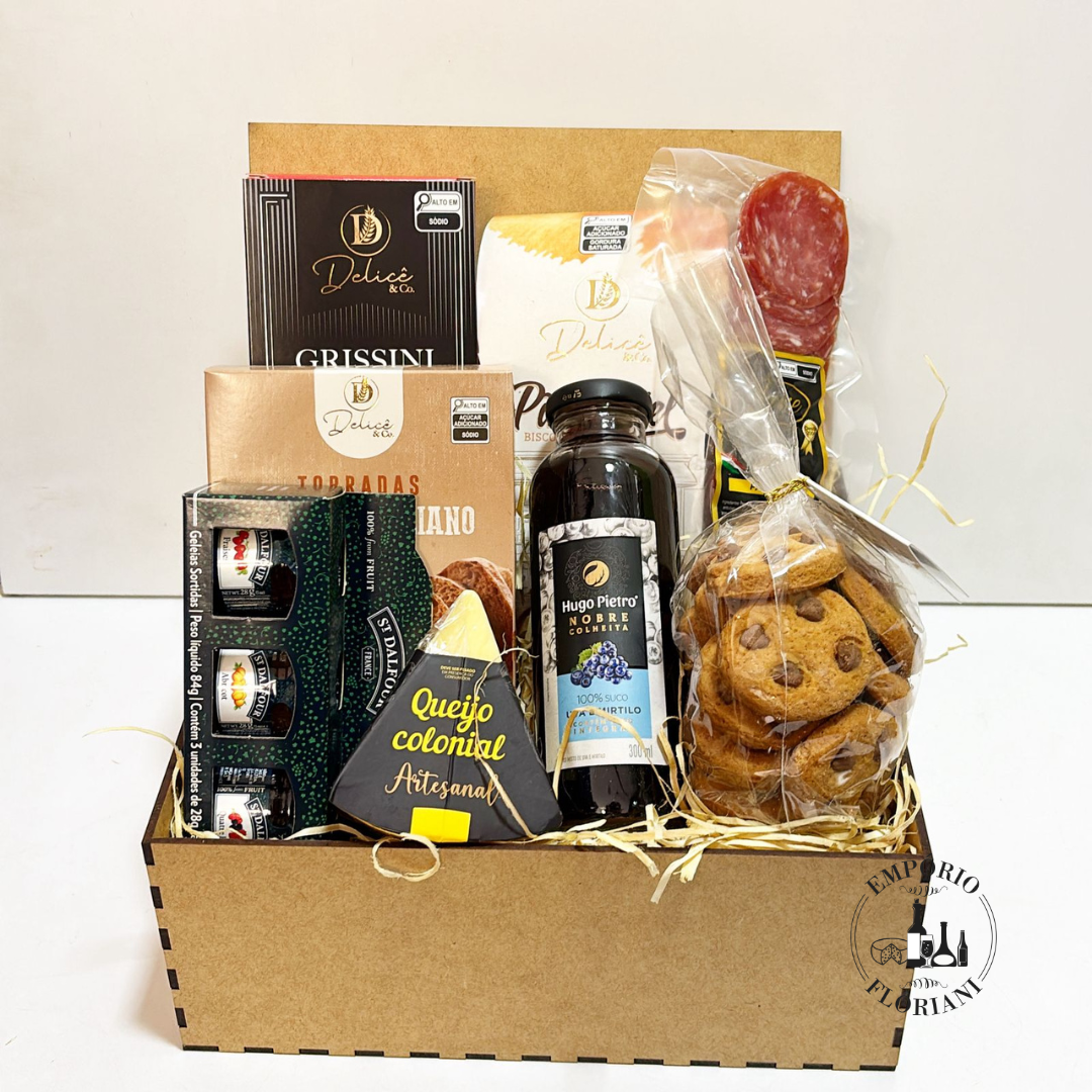 Contém: grissini, torrada, geleia, salame, queijo in natura, pão de mel, suco, biscoito artesanal