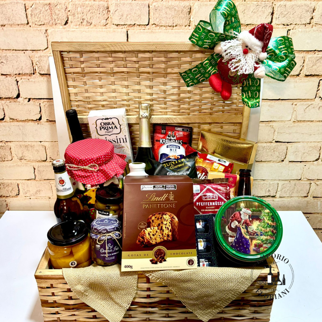 Contem: vinho tinto fino premium 750ml, espumante importado brut ou moscatel 750ml, cerveja importada, cerveja artesanal nacional, chá premium, grissini, vidro bolacha Natal decorada 800gr, compota pêssego importada, caponata ou patê, azeitonas, panetone premium 400gr, bruschetta, batata chips, caixa bombons importados, salgadinho, torradas, pão de mel importado, geleia, cookies lata natal importado.