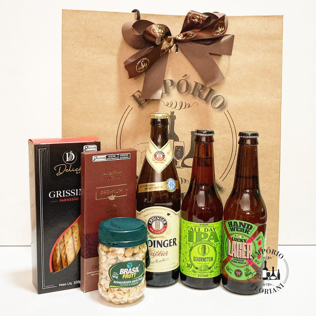 Contém: 1 cerveja importada 500ml, 2 cerveja artesanais 355ml, grissini, amendoim salgado, chocolate premium