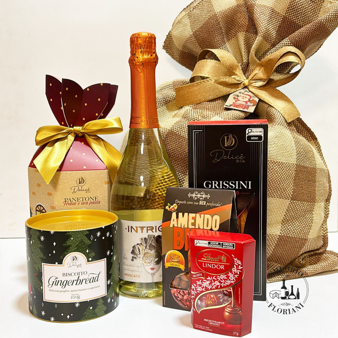 Contem: panetone ou chocotone artesanal 250gr, espumante importado brut ou moscatel 750ml, biscoito gingebread, caixa bombons importados, grissini, amendoim salgado